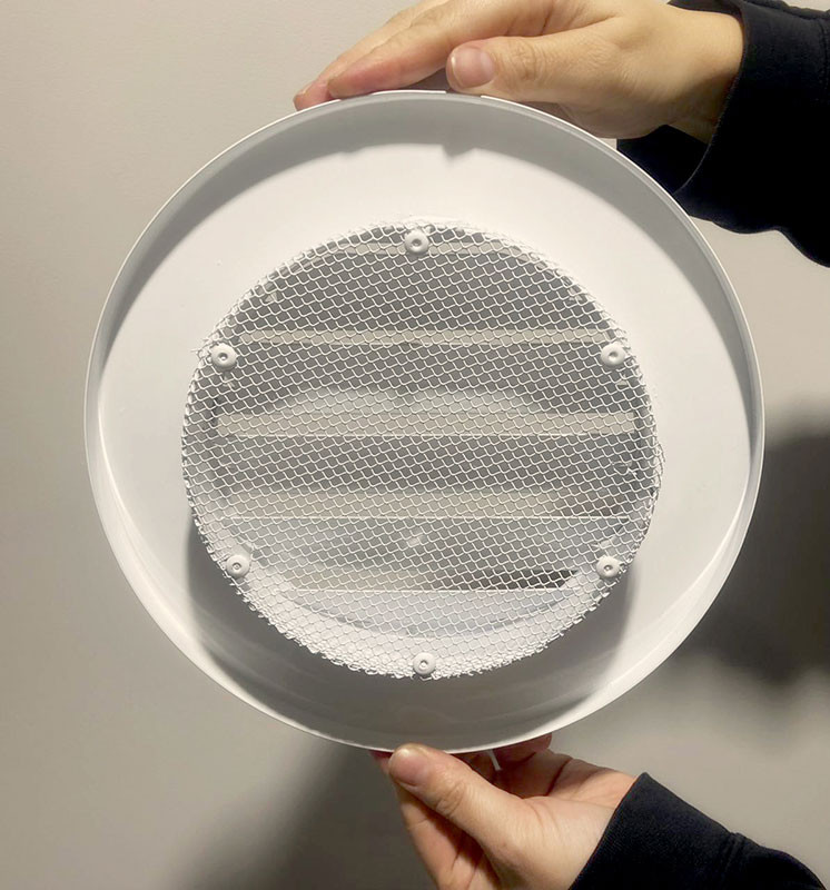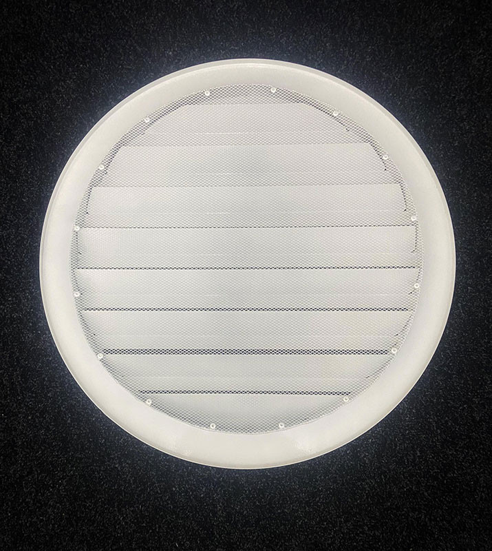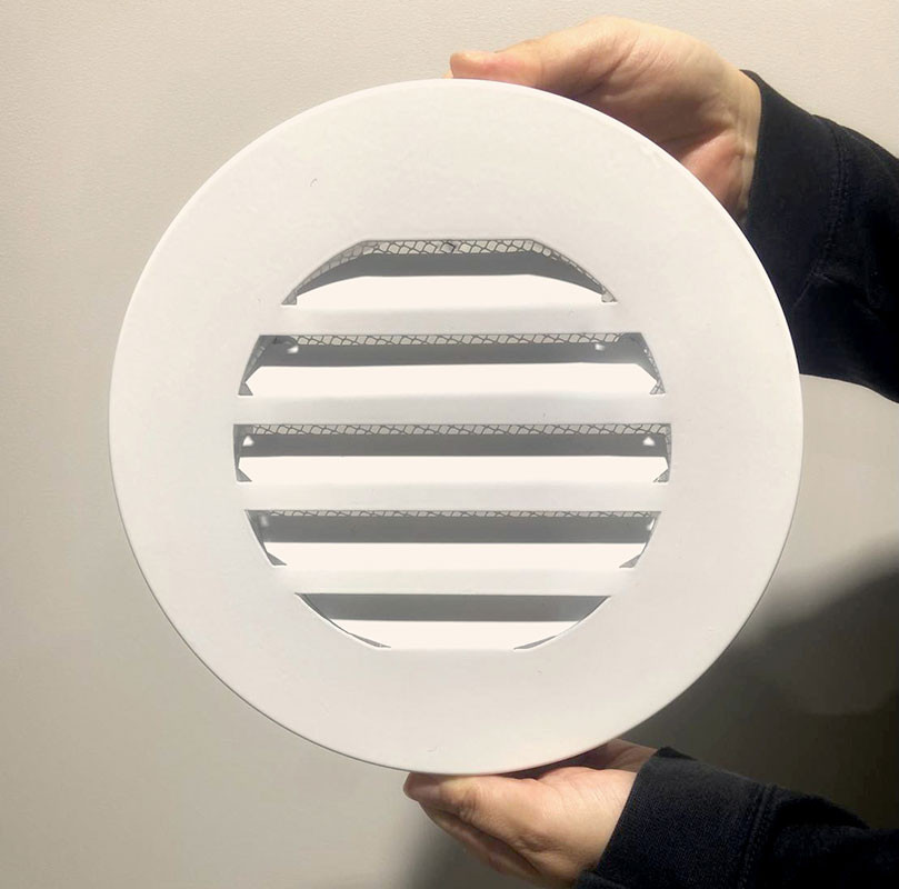 Решетка представляет собой рамку и полотно из ламелей, отогнутых внутрь на 45°. На тыльной стороне решетки установлена сетка для защиты вентиляционного канала от крупного мусора и грызунов.